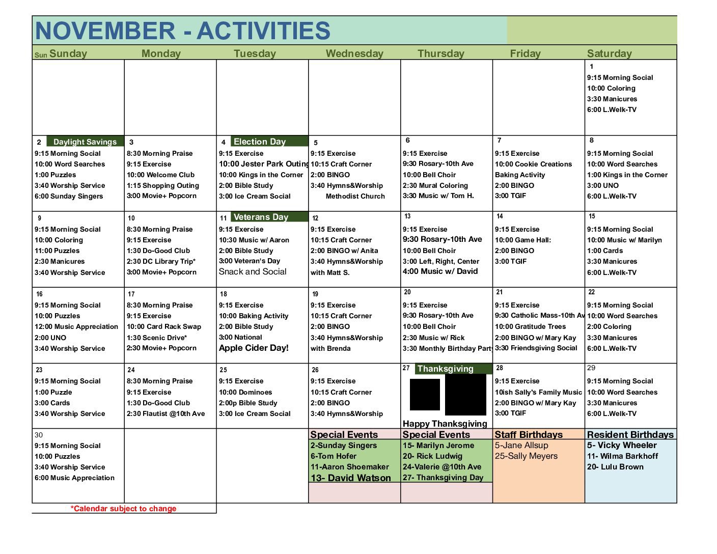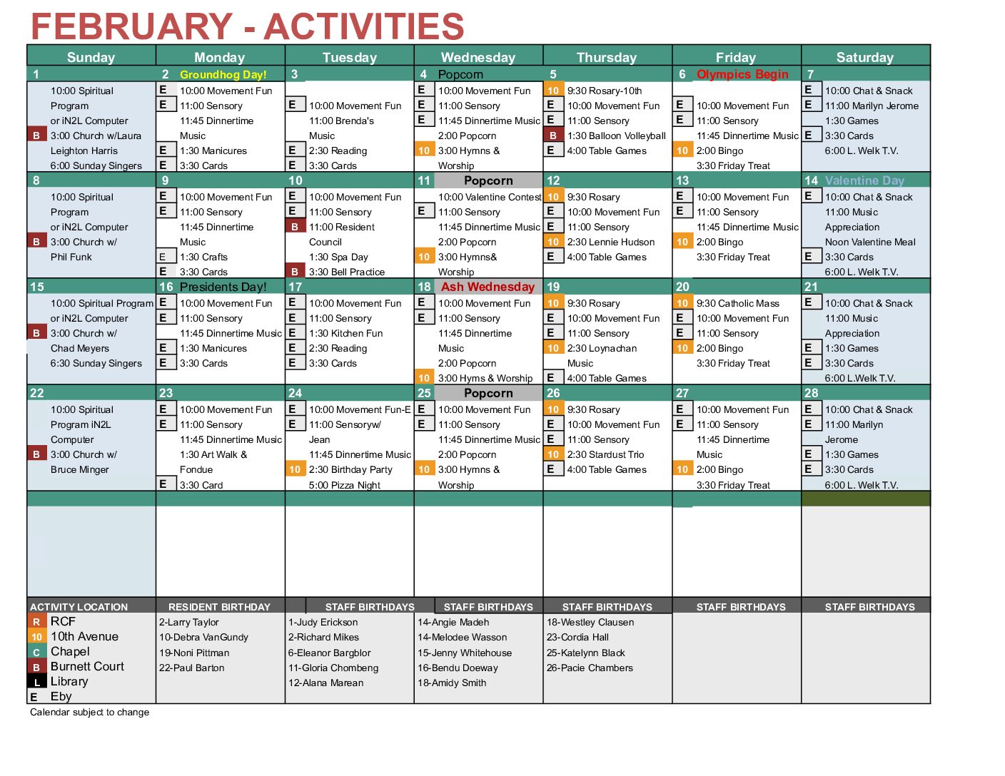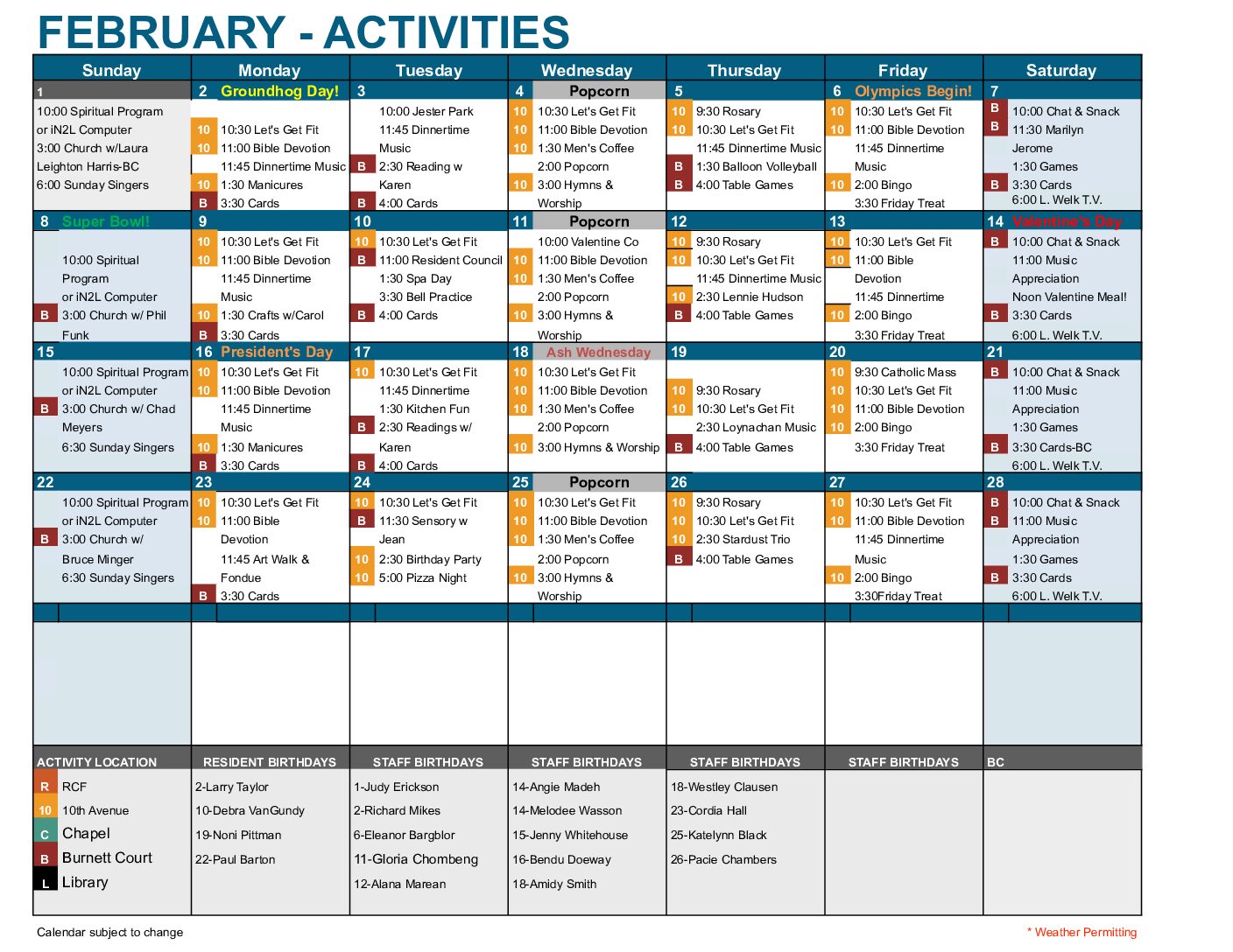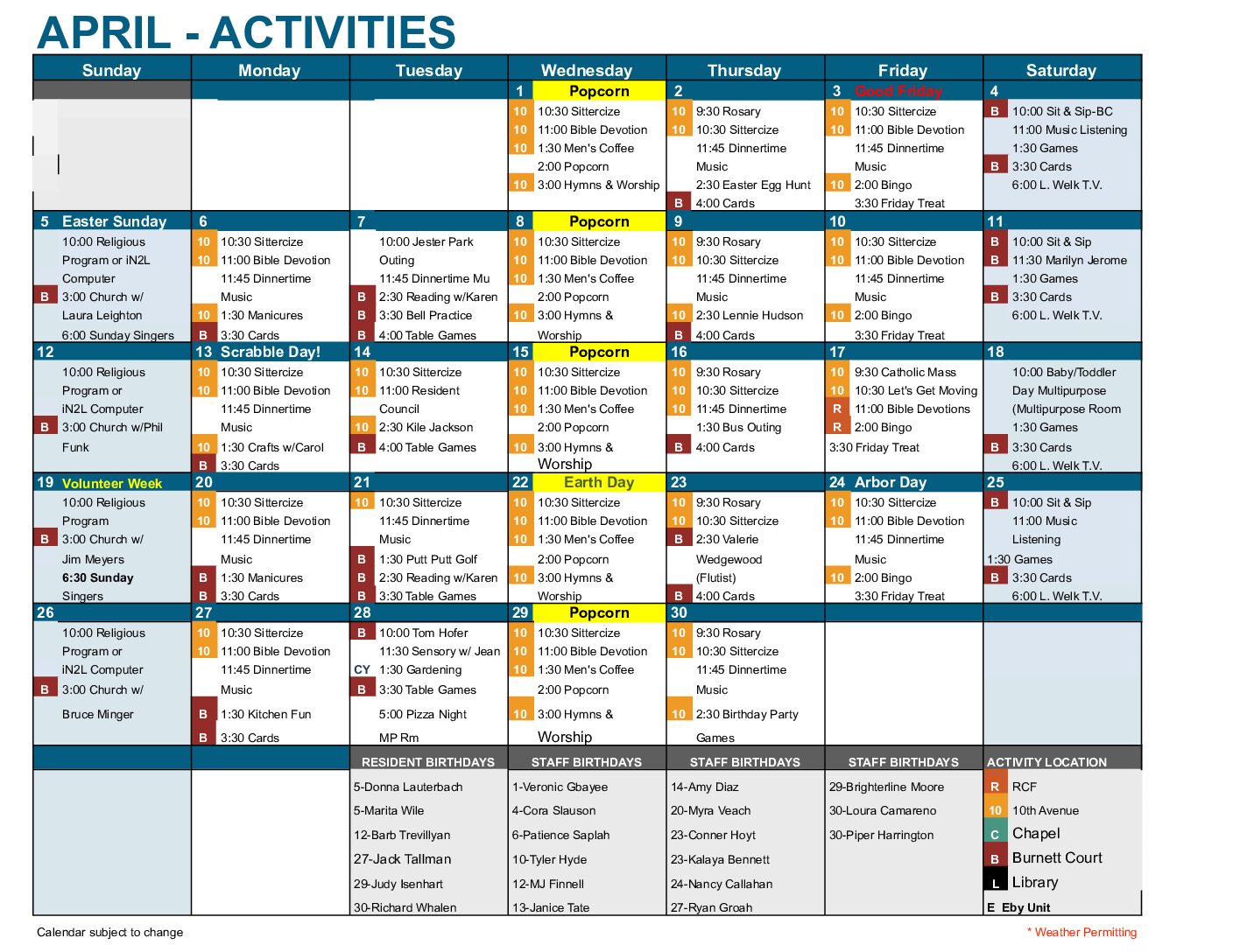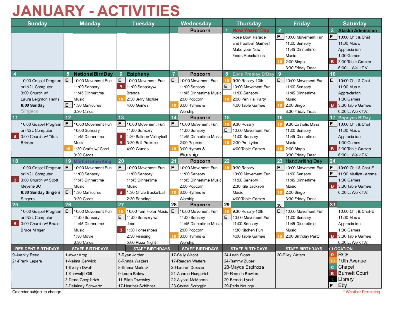 Our activities calendars are thoughtfully designed to enrich the lives of our cherished residents, providing a diverse array of engaging and fulfilling experiences. We understand that retirement is a time for continued growth and connecting with like-minded individuals. Each of our activities calendars are tailored to meet the level of care for each of our residents.